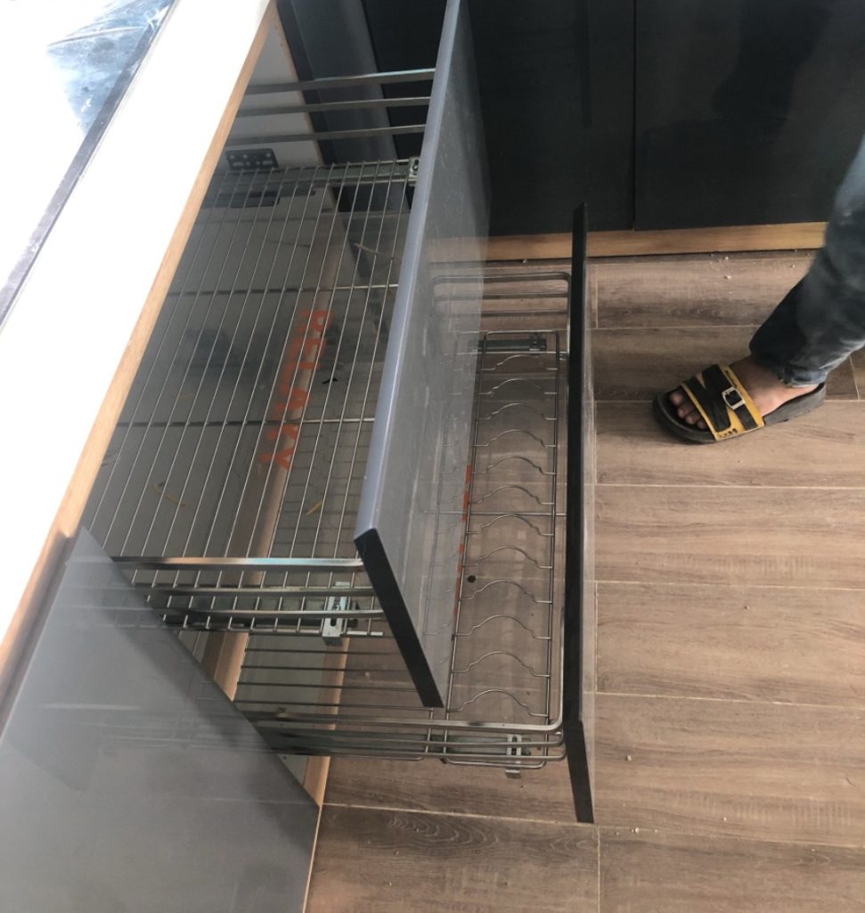 Kệ để dao thớt chai lọ cũng ko thể thiếu được trong gian bếp. Khách hàng thiết kế cánh kéo để tiện khi nấu ăn.